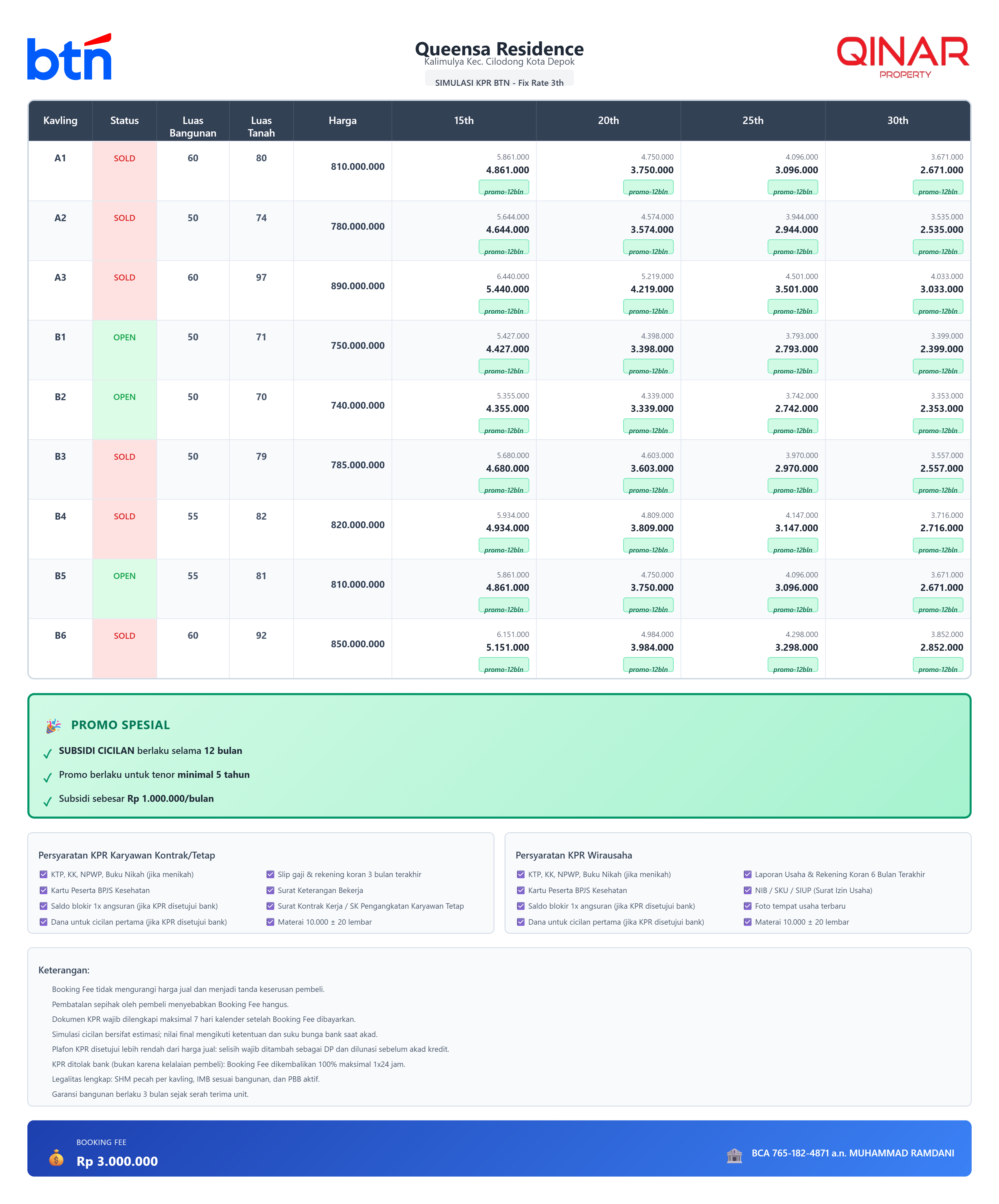 Jangan lewatkan kesempatan ini untuk memiliki rumah impian Anda di Queensa Residence. Hubungi kami segera untuk informasi lebih lanjut dan jadwalkan kunjungan untuk melihat langsung keindahan serta keunggulan yang ditawarkan oleh hunian ini. Rumah modern, lokasi strategis, dan lingkungan nyaman menanti Anda!